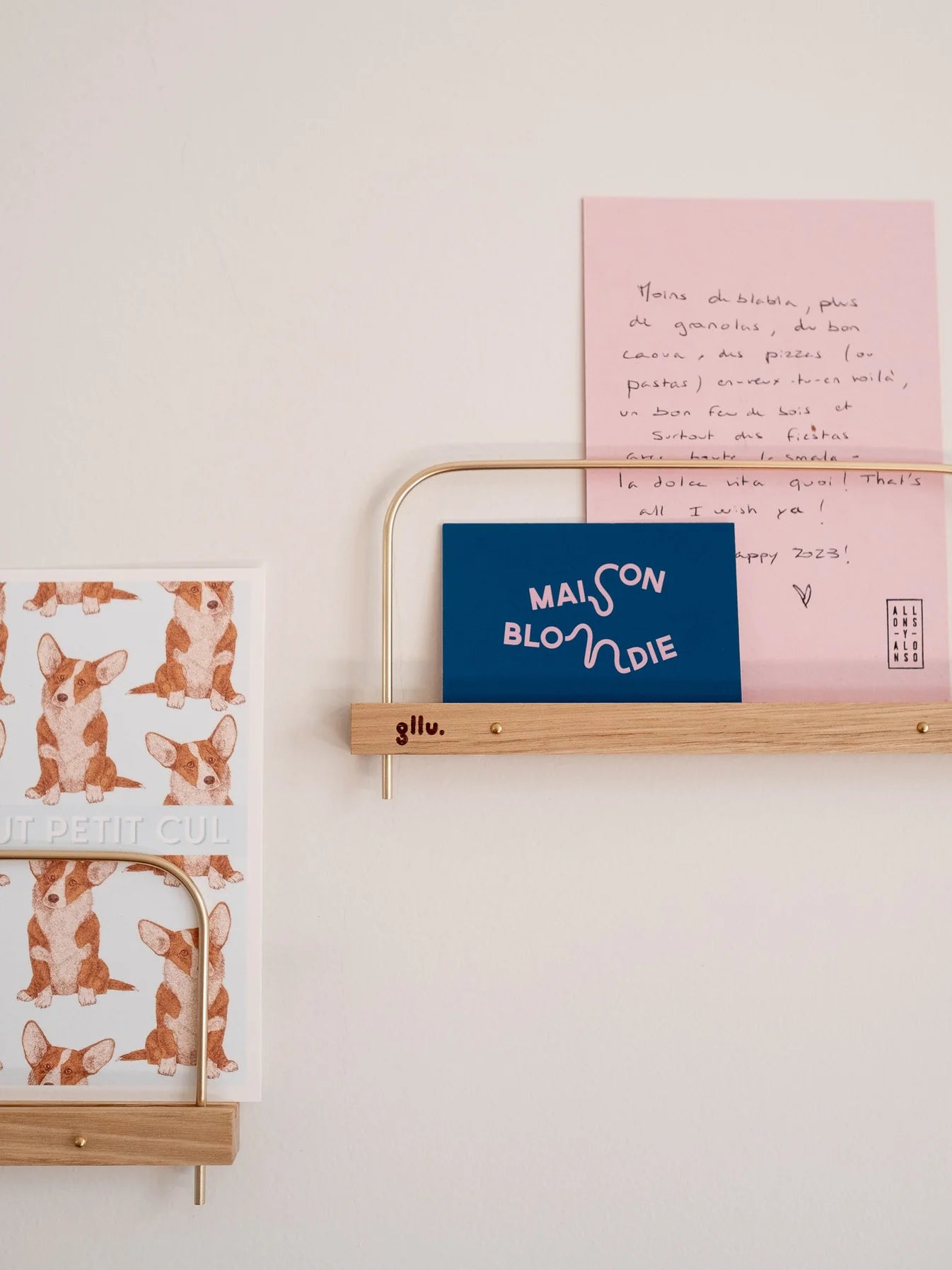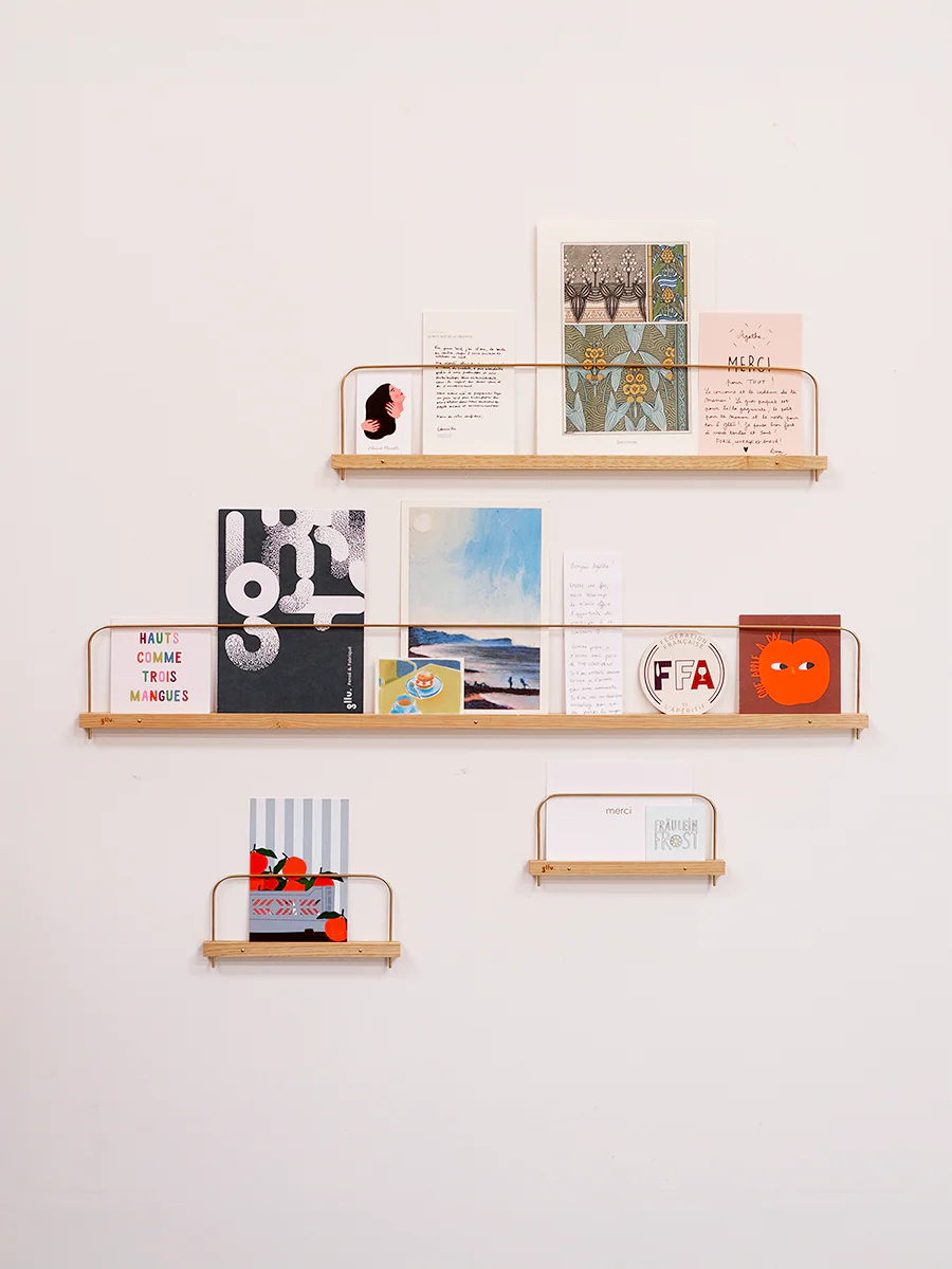 De combinatie van het naturelle hout en de gouden messing stang maakt alles extra hip, perfect voor je persoonlijke tentoonstelling!