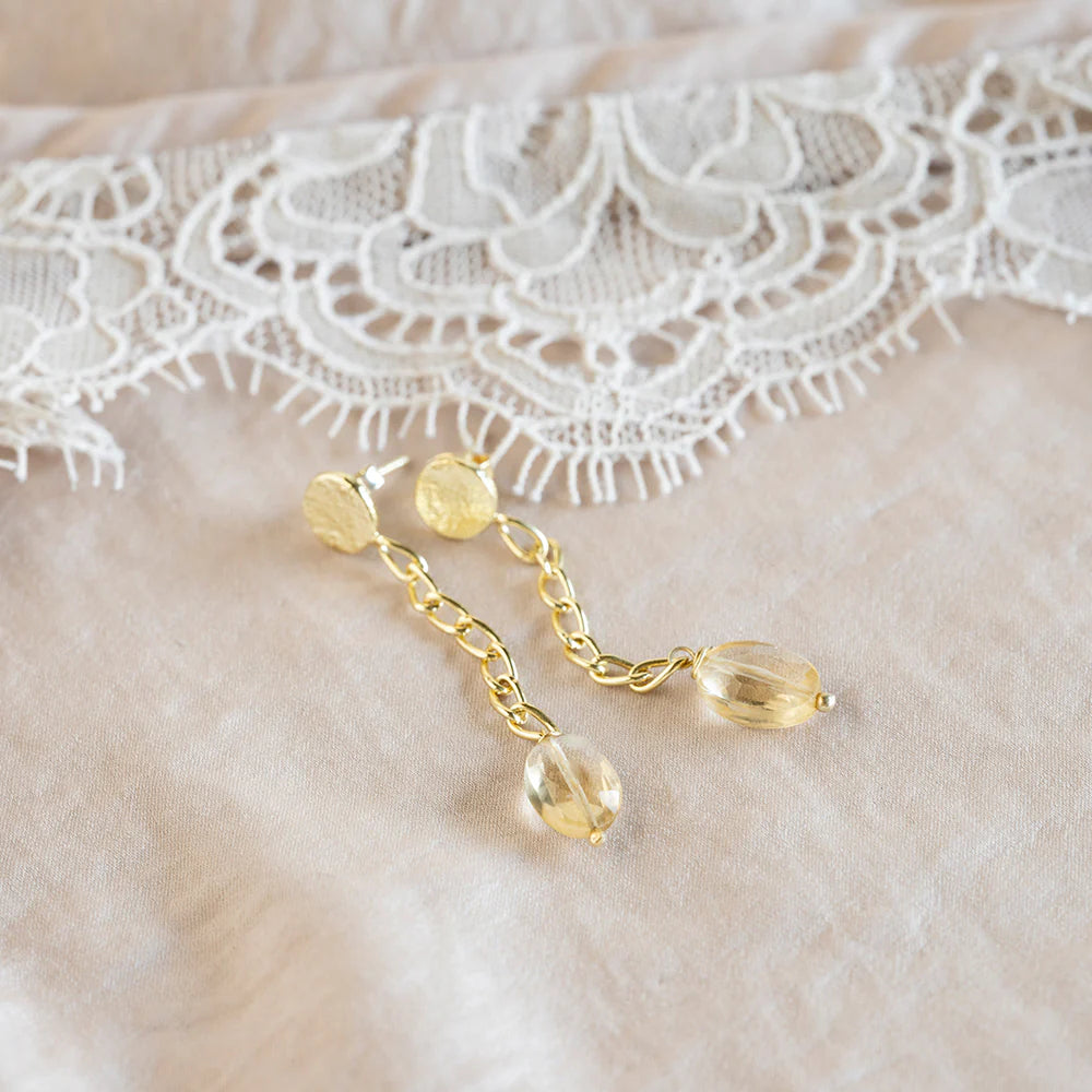 Aan de vergulde mini-coin studs bungelt een sierlijk schakelkettinkje met facetgeslepen citrien-edelsteen. Handgemaakt in Nepal, met liefde en vakmanschap. Edelstenen zijn natuurproducten. Elke edelsteen is uniek. Daarom kan de kleur van jouw sieraad iets afwijken van de afbeelding.